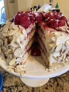 Using your hands, gently press the sliced almonds all around the sides of the cake. Then top with fresh raspberries!