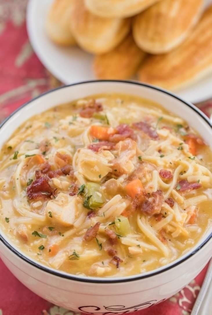 Crack Chicken Noodle Soup 😍 Ingredients: 3 cups chopped cooked chicken (I used rotisserie chicken) 1 (10.5-oz) can condensed cheese…